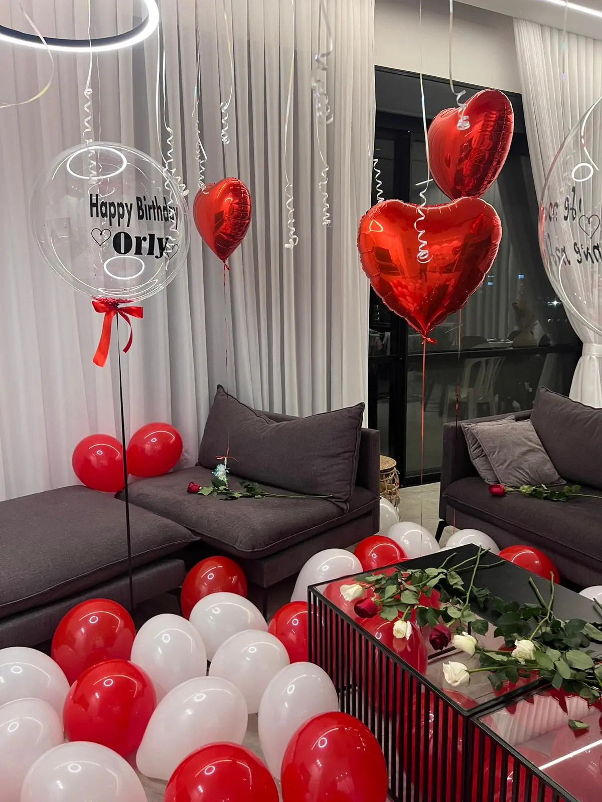 עיצוב רומנטי ויוקרתי ליום האהבה הכולל בלוני הליום אדומים בצורת לב, בלון שקוף עם כיתוב אישי, בלונים אדומים ולבנים מפוזרים על הרצפה ושילוב ורדים אדומים ולבנים על שולחן הסלון. העיצוב יוצר אווירה אינטימית, מרגשת ומלאת אהבה, מושלם להפתעה זוגית, ולנטיין דיי, יום נישואין, הצעת נישואין או מחווה רומנטית בלתי נשכחת בבית.