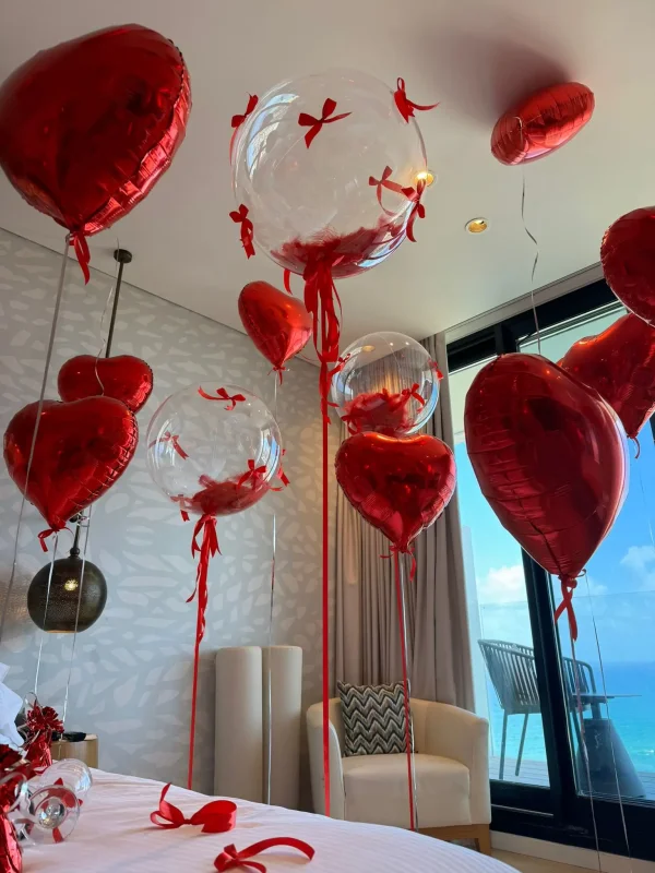 עיצוב בלונים אלגנטי ומלא סטייל שמשלב בלוני לב אדומים עם בלונים שקופים מעוצבים בפנים ובסרטים אדומים ארוכים. הבלונים מרחפים בגבהים שונים ויוצרים עומק ותנועה בחלל, עם נוכחות רומנטית אבל נקייה ולא עמוסה. מתאים במיוחד להפתעה זוגית, יום אהבה, הצעת נישואין או עיצוב חדר במלון עם וייב יוקרתי ומרגש שנכנס ישר ללב.