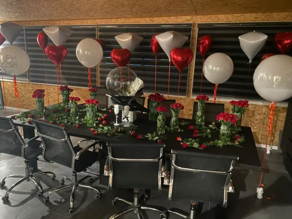 עיצוב רומנטי לשולחן עם בלוני לב וורדים אדומים – יום האהבה